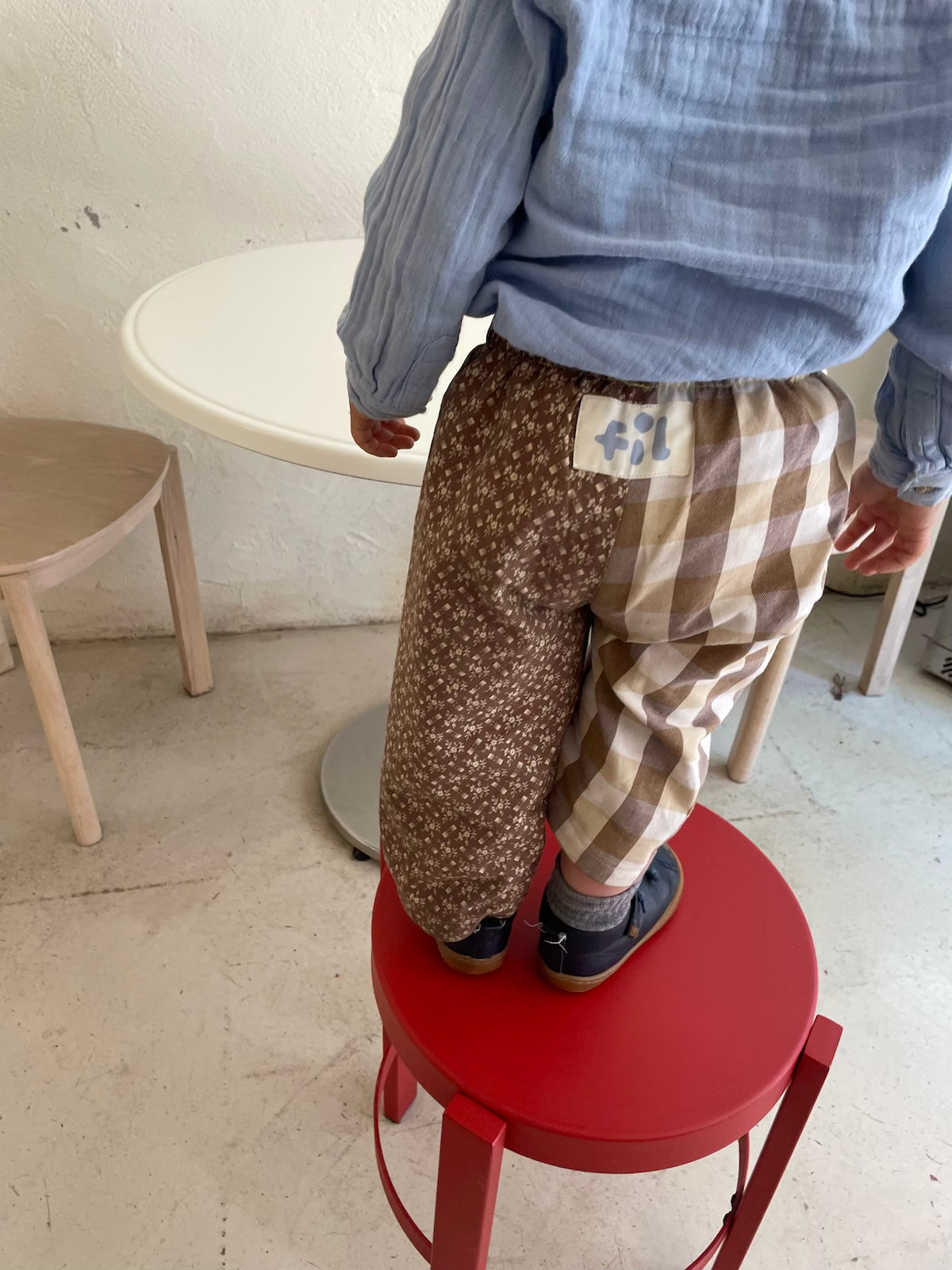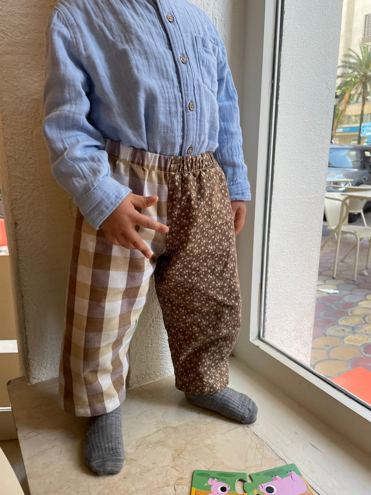 Cappuccino is a pair of comfortable, loose-fitting children's pants that encourage free movement. The elasticated waistband provides a relaxed fit, making dressing easier and allowing the pants to be worn for longer. The brown, floral-print fabric is made of 100% cotton and has a soft texture and medium thickness. The brown and white checkered fabric is a blend of 50% cotton and 50% polyester, with a soft texture and a more consistent medium thickness than the previous one.