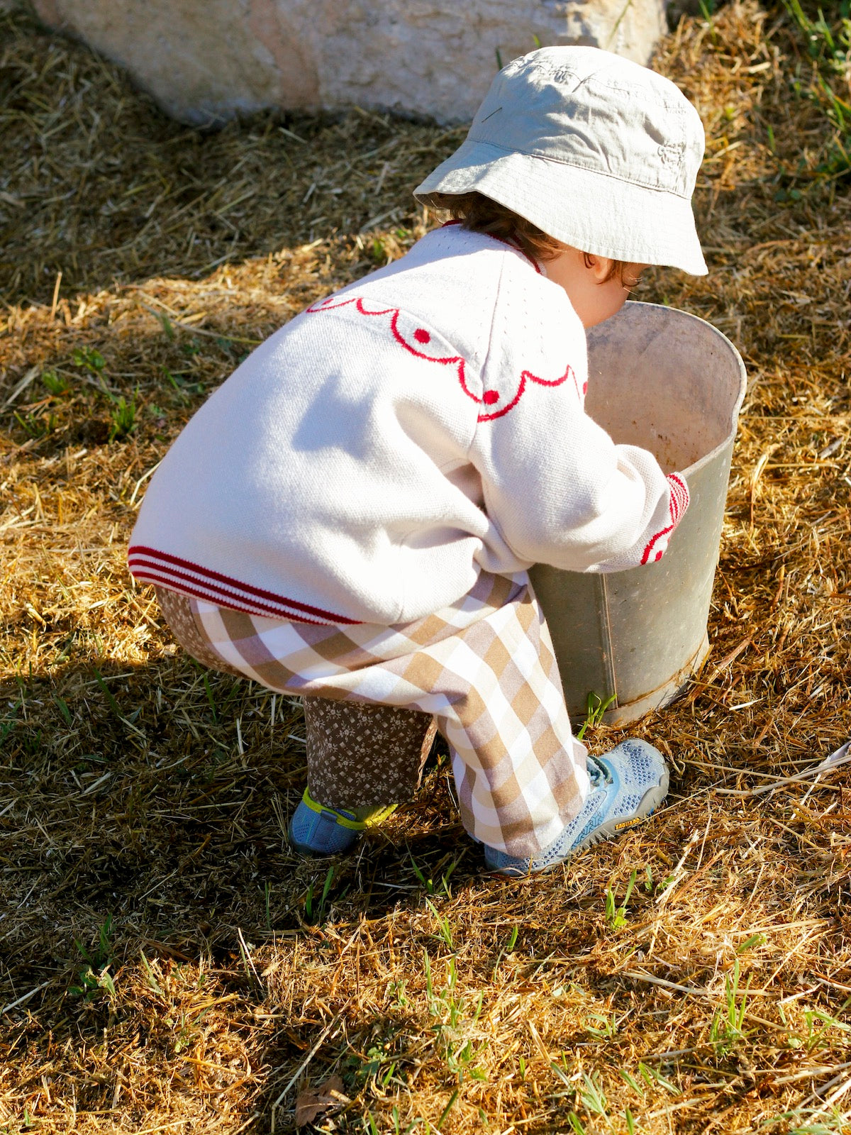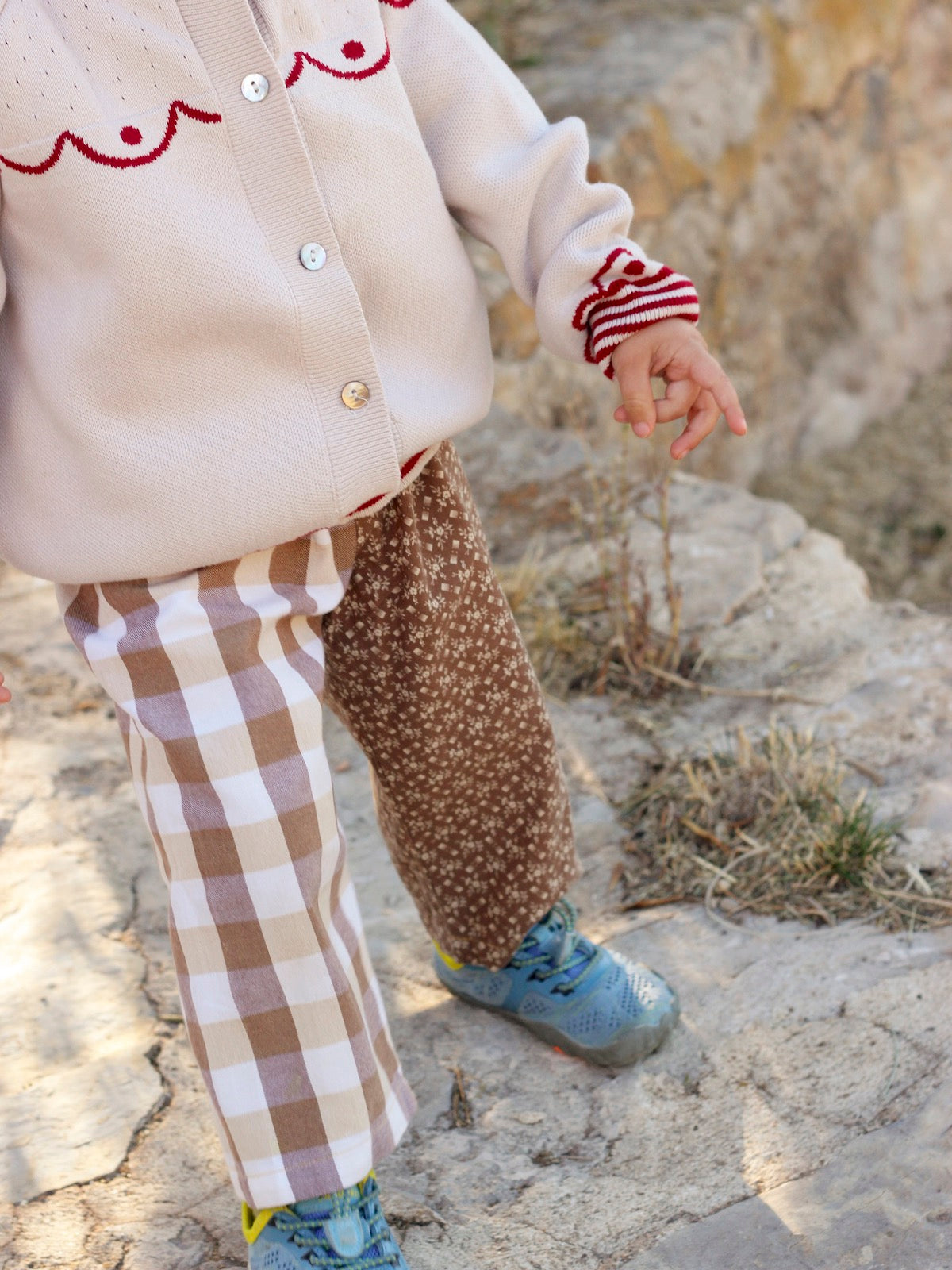 Cappuccino es un pantalón infantil de corte holgado y confortable que favorece el libre movimiento. Su cintura elástica ofrece un ajuste relajado que facilita la tarea de vestirse y permite usar el pantalón por más tiempo. La tela marrón con estampado floral está hecha de algodón 100 % y tiene una textura suave y un grosor medio. La tela a cuadros marrones y blancos es una mezcla de 50 % algodón y 50 % poliéster, con una textura suave y un grosor medio más consistente que la anterior.