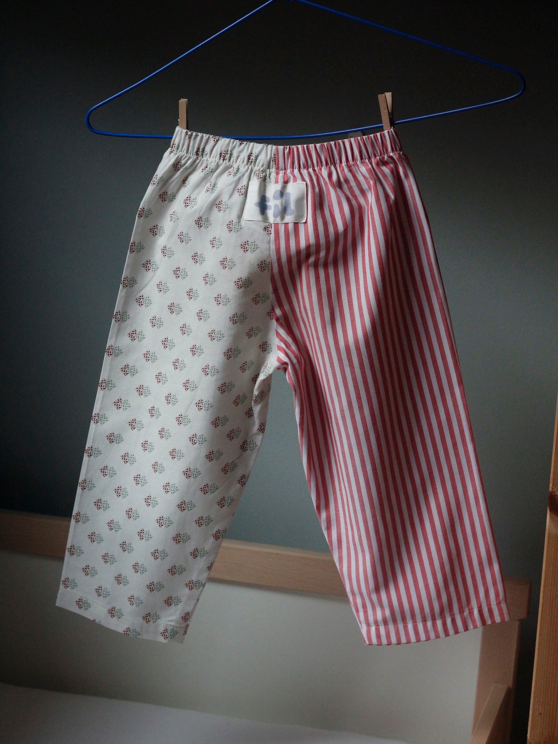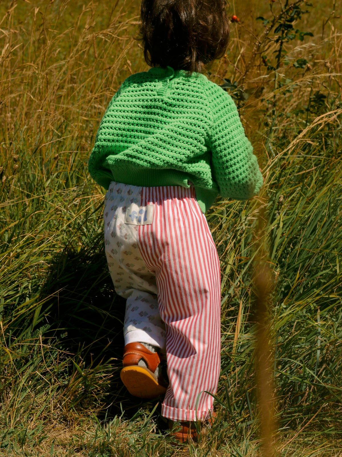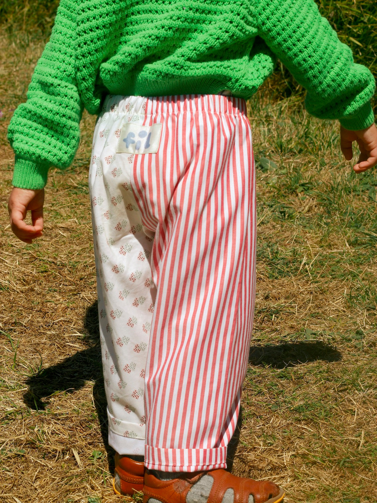 Circ is a pair of comfortable, loose-fitting children's pants that encourage free movement. The elasticated waistband provides a relaxed fit, making dressing easier and allowing the pants to be worn for longer. These pants are made from a combination of red and white striped fabric and a printed fabric with a pearl white background. Both fabrics are 100% cotton with a soft texture and medium thickness.