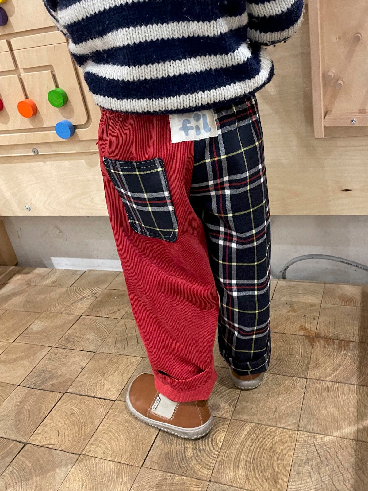 Composición: la tela roja es 100 % algodón micro pana. La tela azul marino a cuadros con detalles en rojo y amarillo es una mezcla de 65 % poliéster, 32 % viscosa y 3 % elastano.