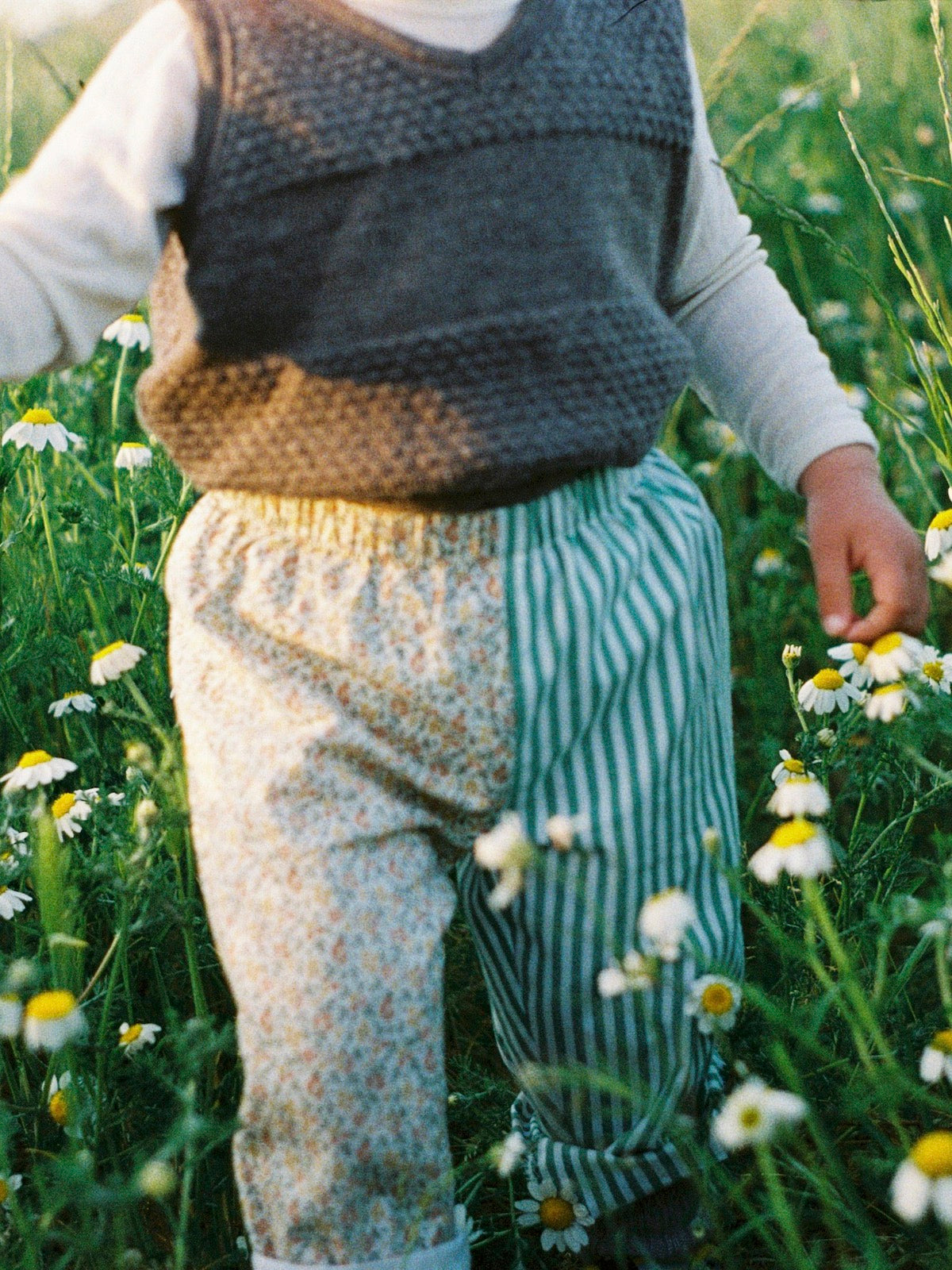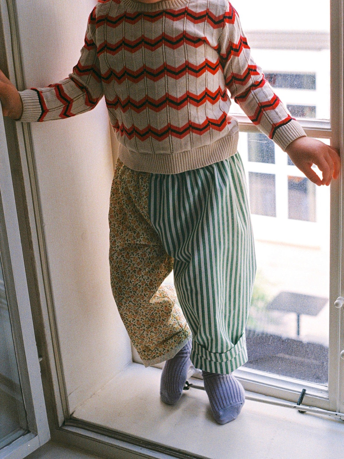Jane es un pantalón infantil de corte holgado y confortable que favorece el libre movimiento. Su cintura elástica ofrece un ajuste relajado que facilita la tarea de vestirse y permite usar el pantalón por más tiempo. Este tejido es 100 % algodón y tiene una textura suave y un grosor medio. Presenta un estampado floral en verde, amarillo y naranja junto con rayas verdes y blancas.