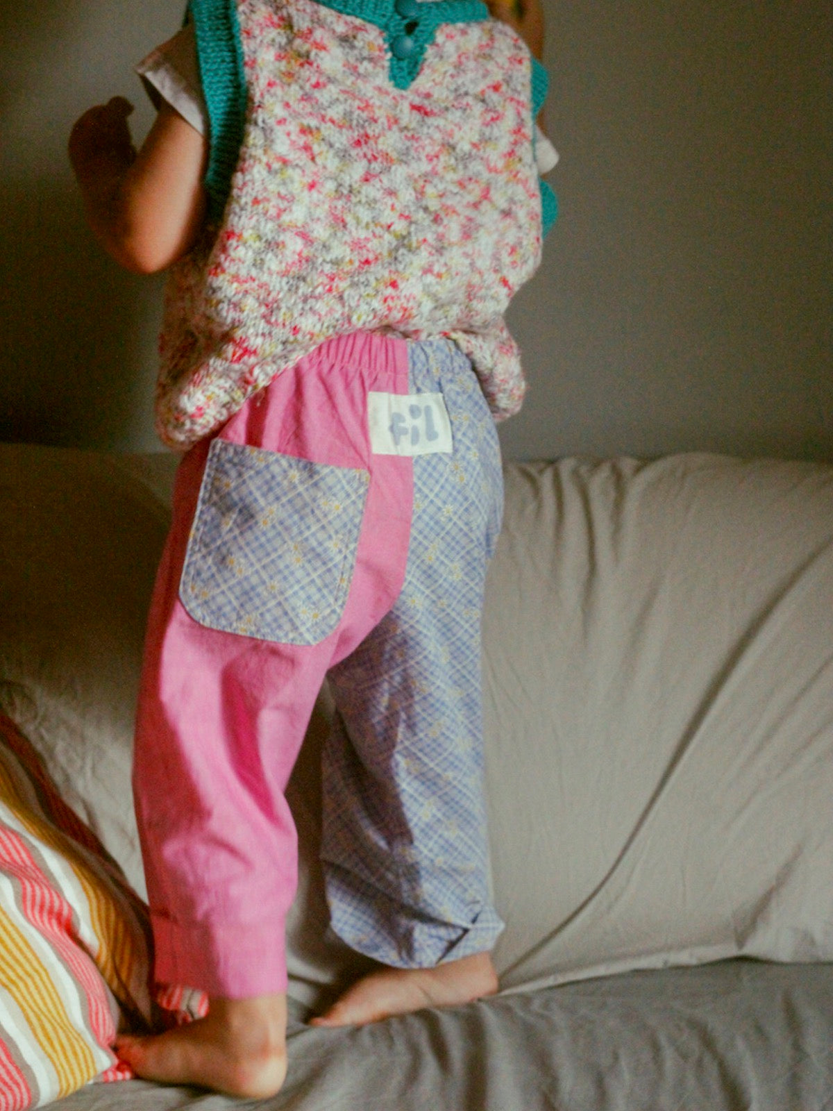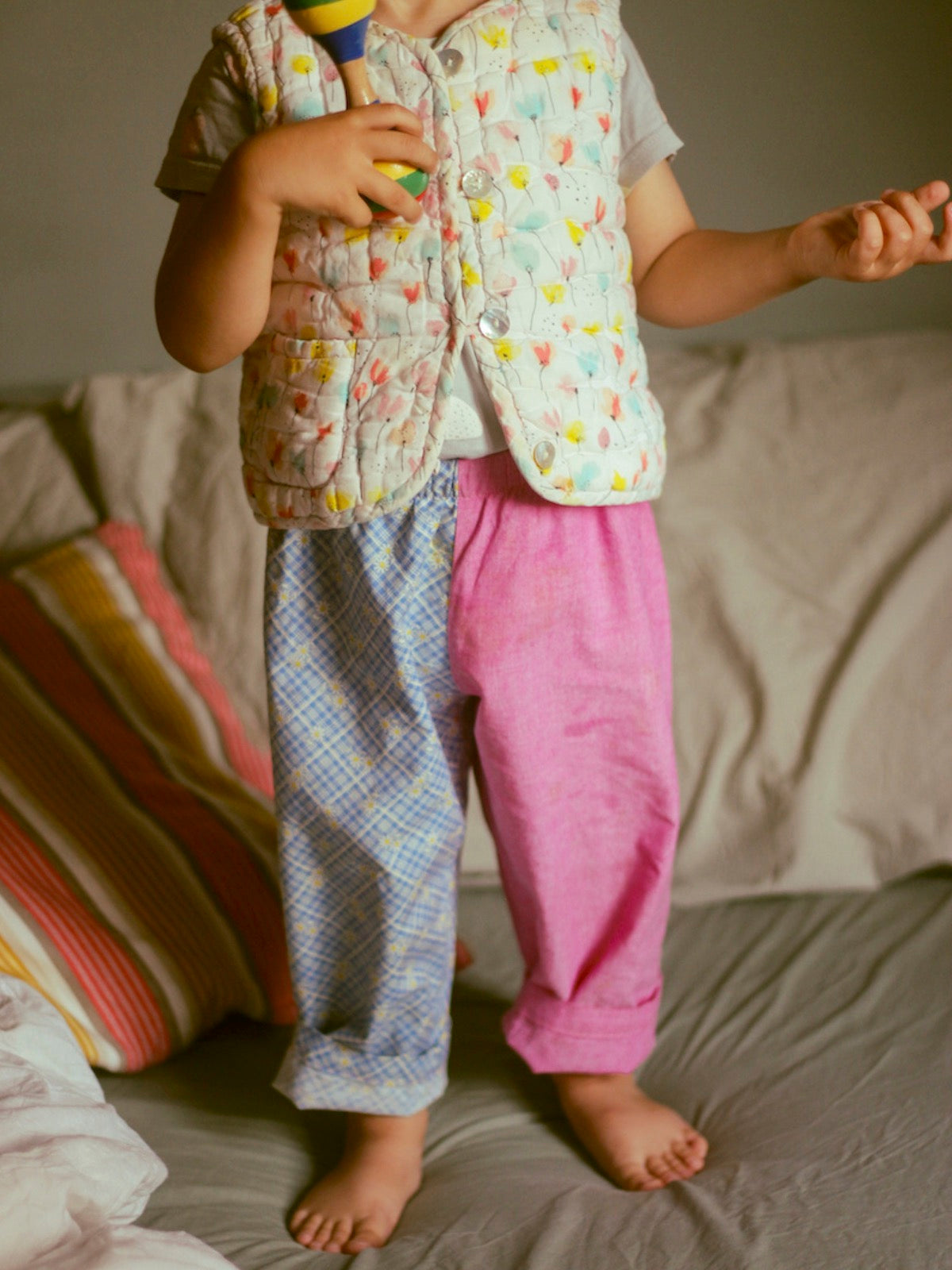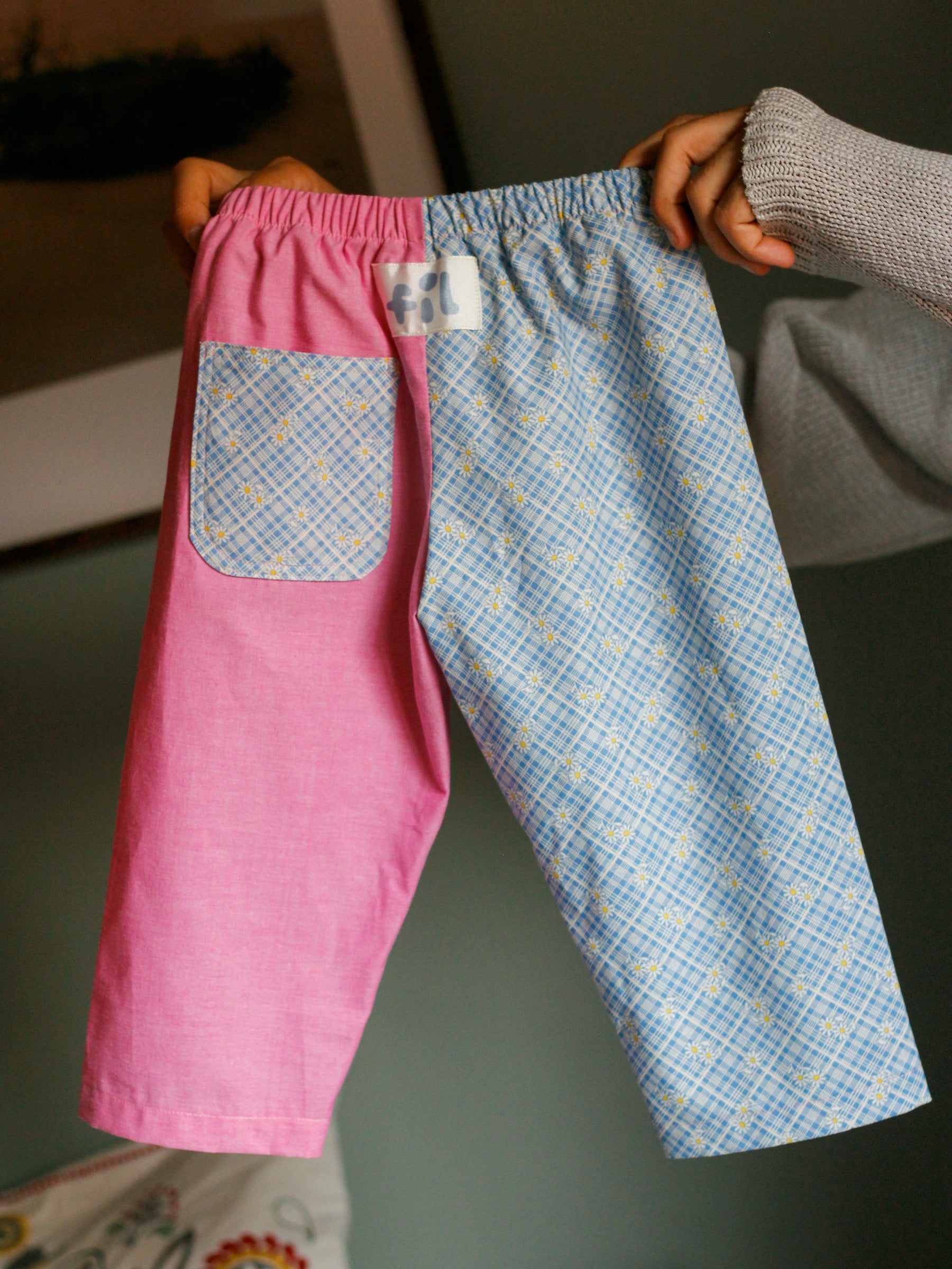 Margerite es un pantalón infantil de corte holgado y confortable que favorece el libre movimiento. Su cintura elástica ofrece un ajuste relajado que facilita la tarea de vestirse y permite usar el pantalón por más tiempo. Estos pantalones combinan tela rosa lisa con tela azul estampada con margaritas. Ambas son 100 % algodón con una textura suave y un grosor fino.