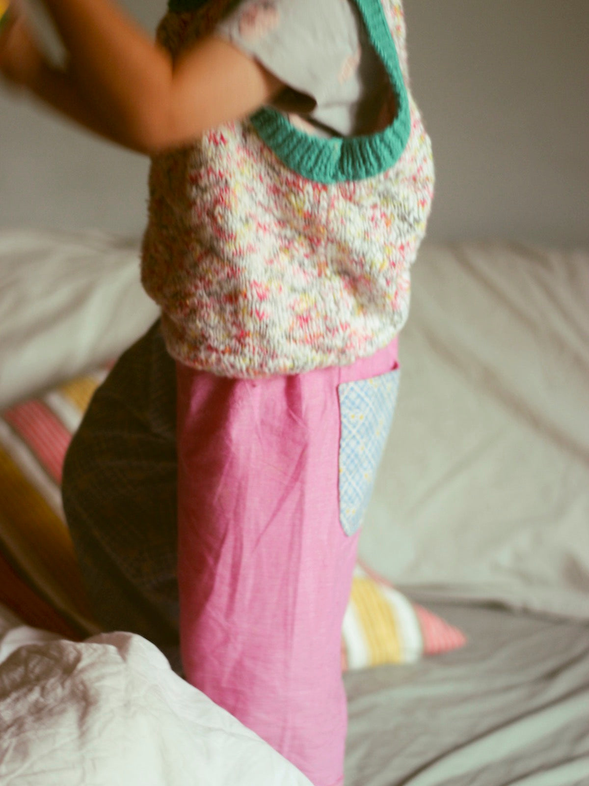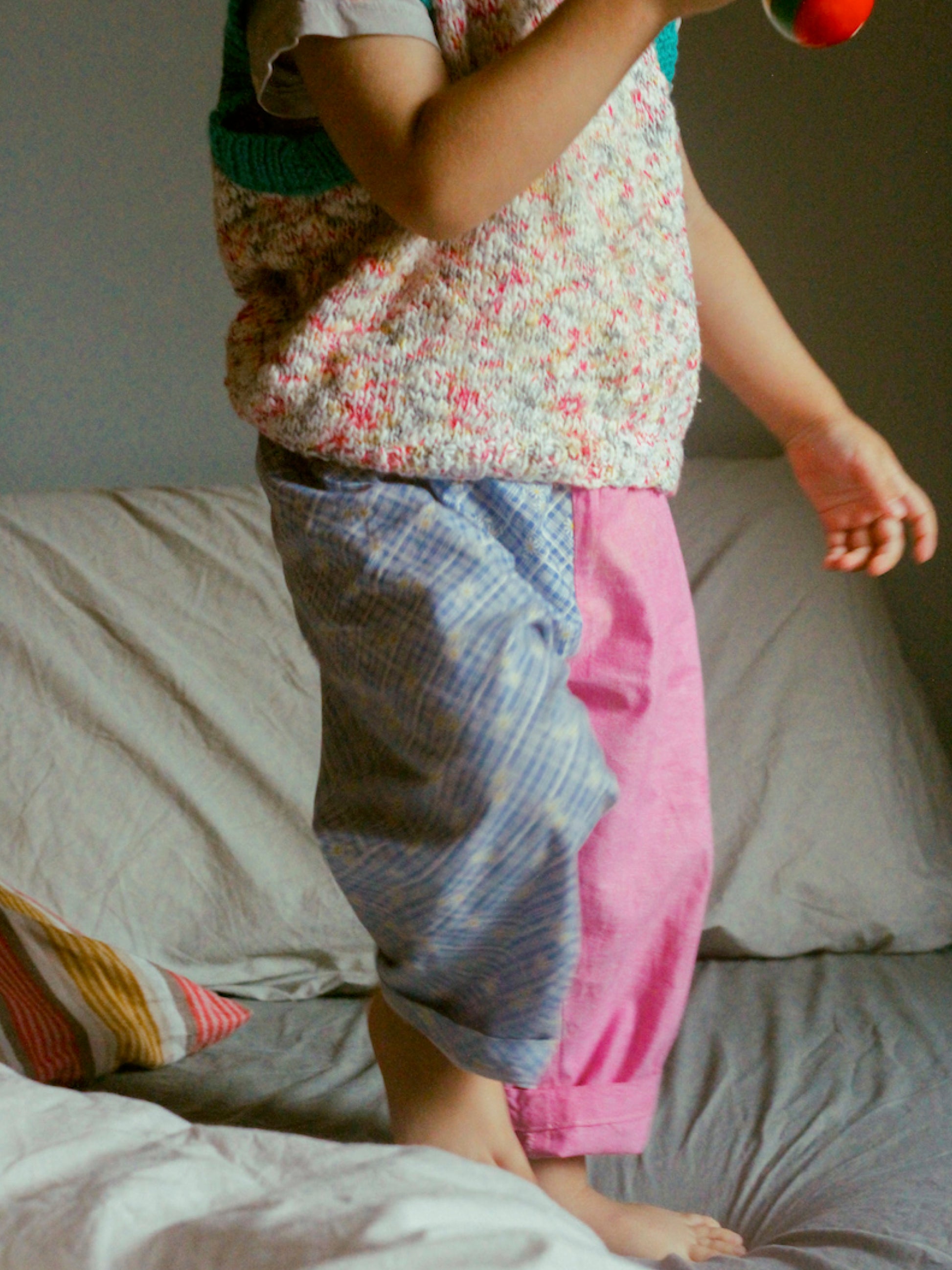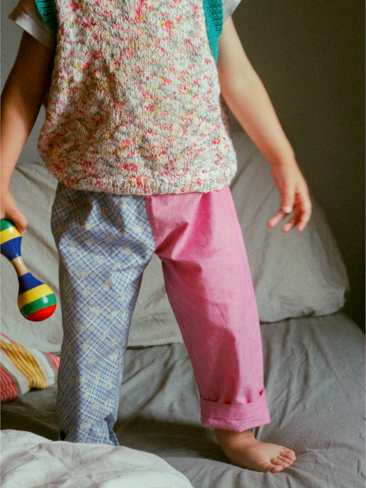 Margerite es un pantalón infantil de corte holgado y confortable que favorece el libre movimiento. Su cintura elástica ofrece un ajuste relajado que facilita la tarea de vestirse y permite usar el pantalón por más tiempo. Estos pantalones combinan tela rosa lisa con tela azul estampada con margaritas. Ambas son 100 % algodón con una textura suave y un grosor fino.