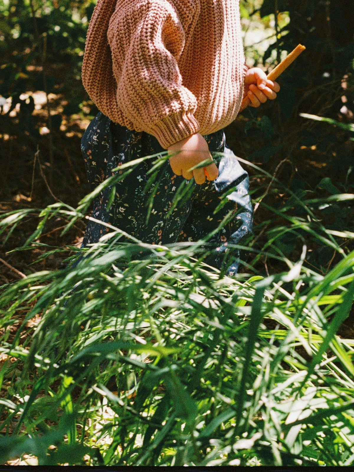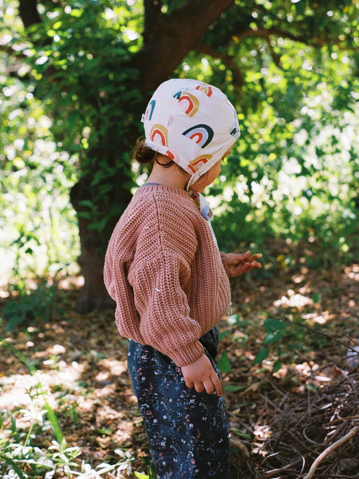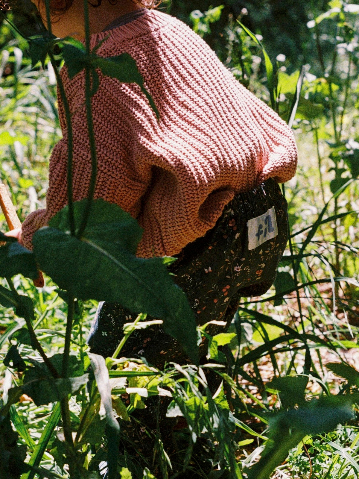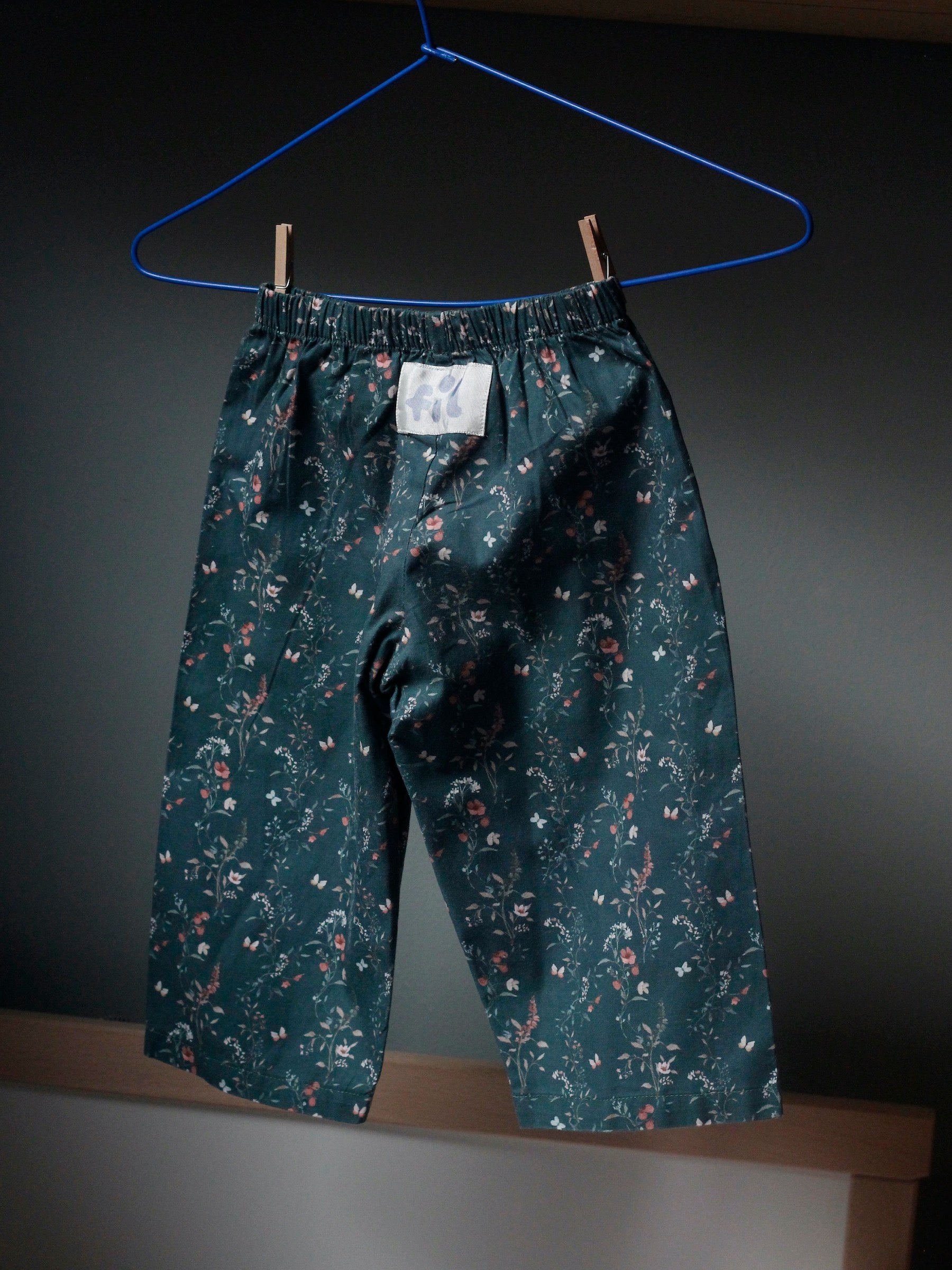 Nenuphar es un pantalón infantil de corte holgado y confortable que favorece el libre movimiento. Su cintura elástica ofrece un ajuste relajado que facilita la tarea de vestirse y permite usar el pantalón por más tiempo. La tela es 100 % algodón, con un estampado verde botella de motivos florales y mariposas. Tiene una textura suave y un grosor medio.