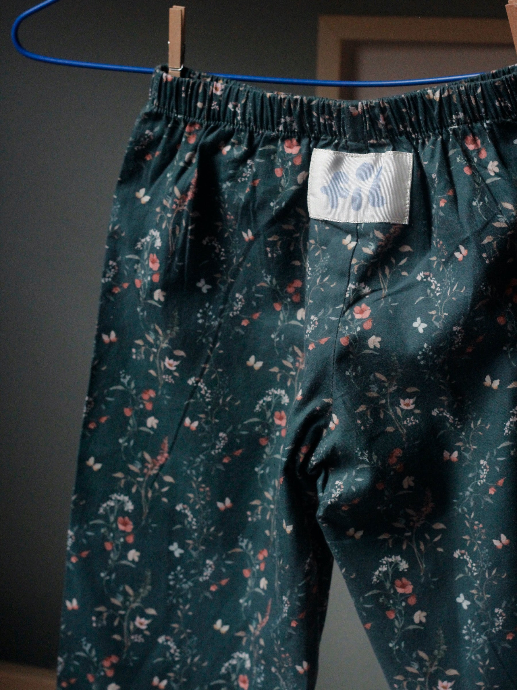 Nenuphar is a pair of comfortable, loose-fitting children's pants that encourage free movement. The elasticated waistband provides a relaxed fit, making dressing easier and allowing the pants to be worn for longer. The fabric is 100% cotton with a bottle green print, floral motifs and butterflies, a soft texture and medium thickness.
