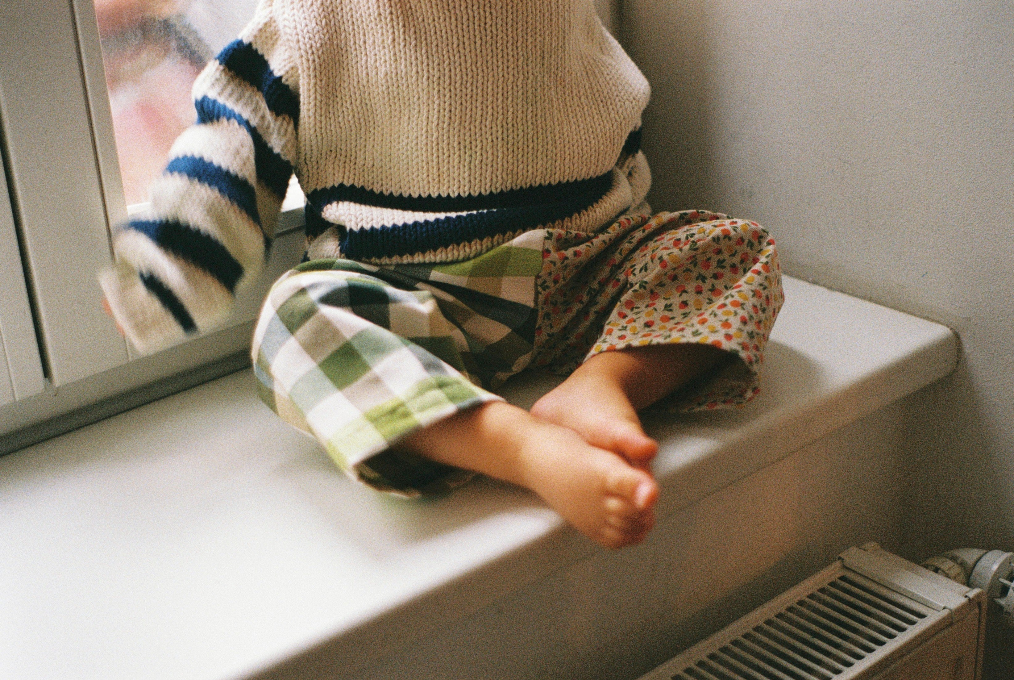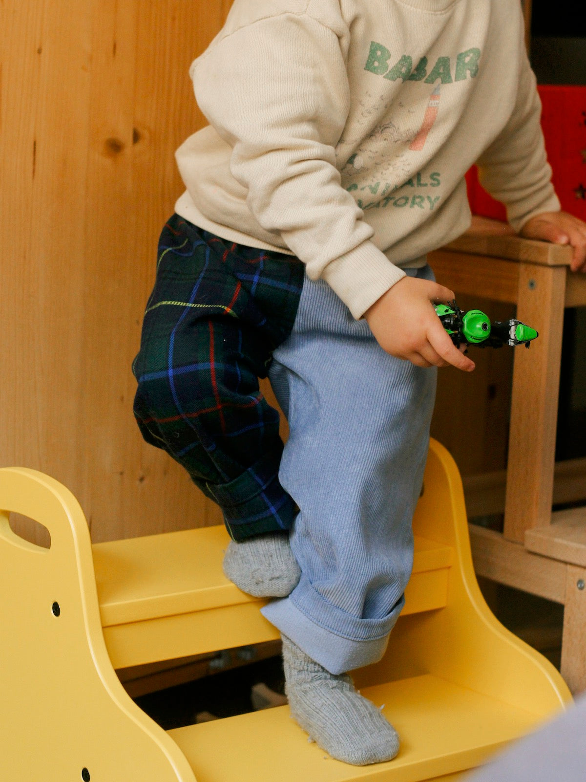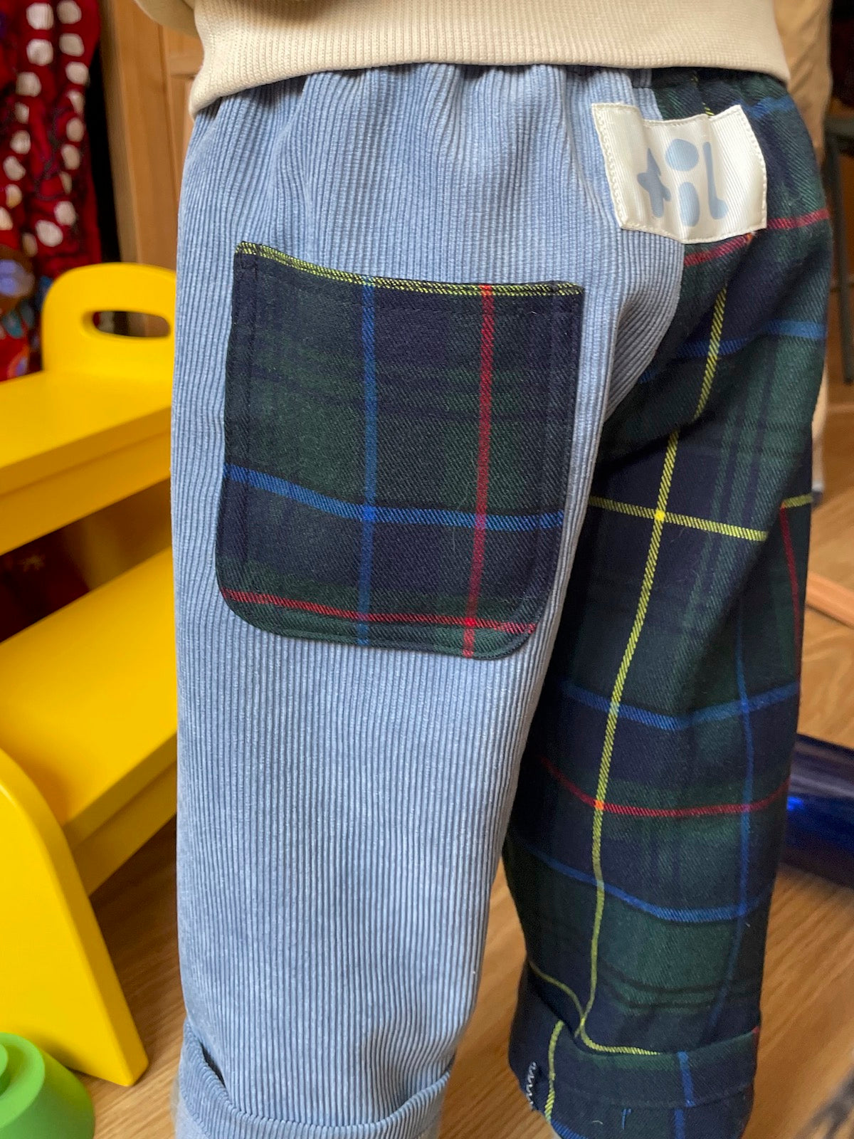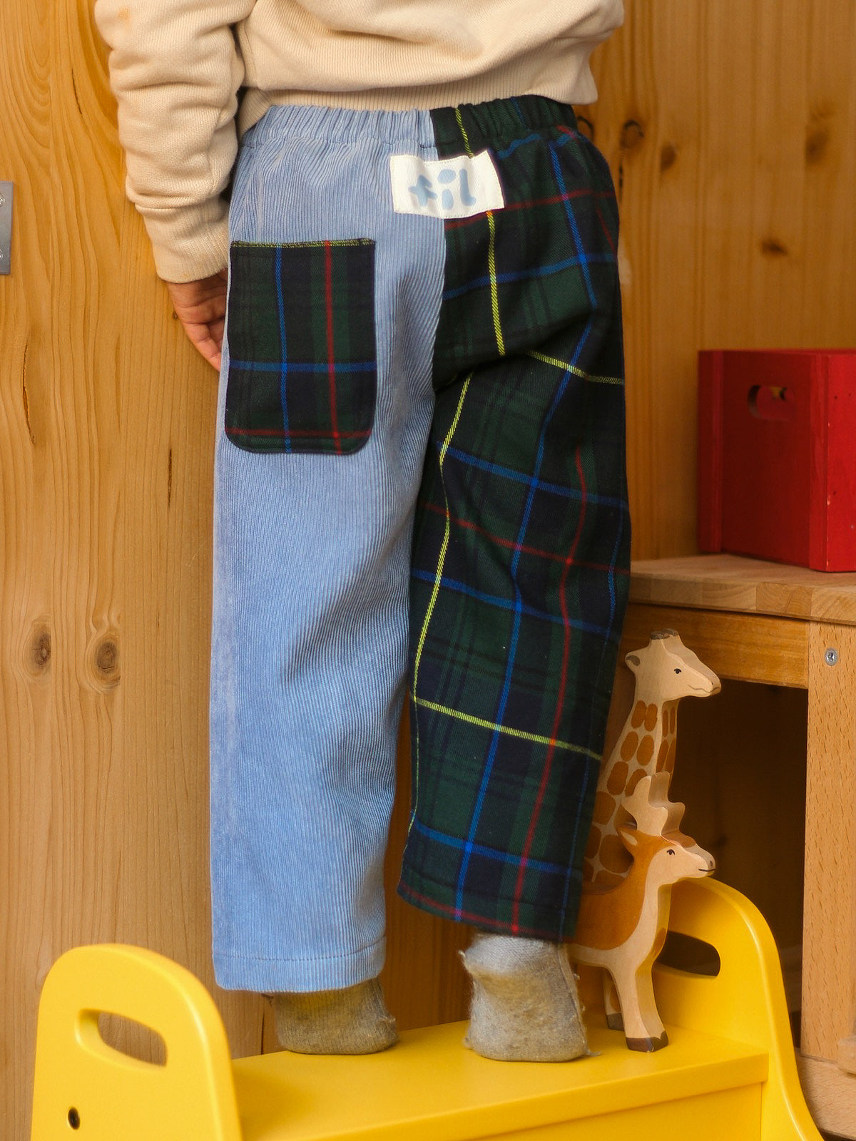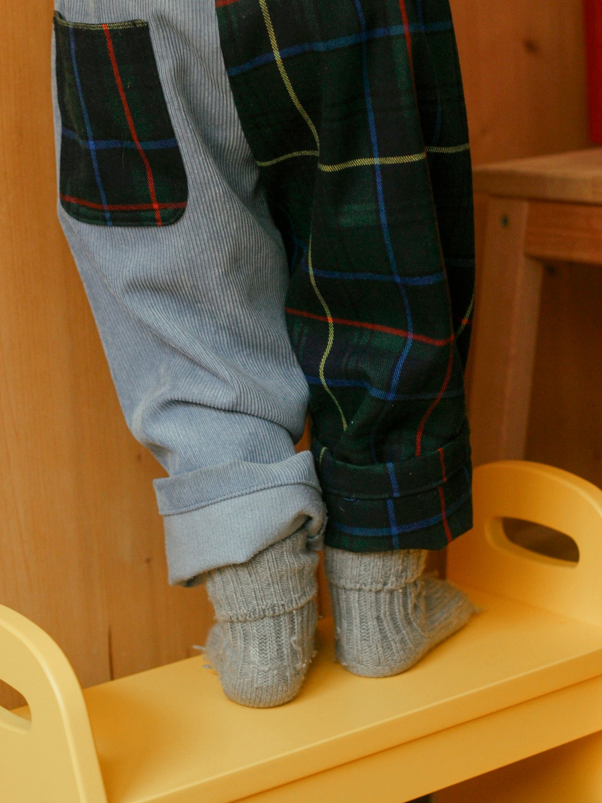Odile is a pair of comfortable, loose-fitting children's pants that encourage free movement. The elasticated waistband provides a relaxed fit, making dressing easier and allowing the pants to be worn for longer. The blue fabric is 100% cotton micro corduroy. The bottle-green, checked fabric with red, blue and yellow details is made from an 80% polyester and 20% fibre blend. Both fabrics have a soft, warm texture that makes them ideal for cool days.