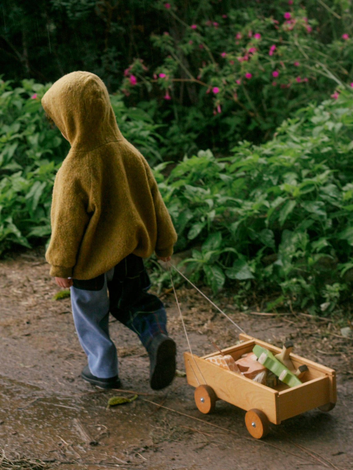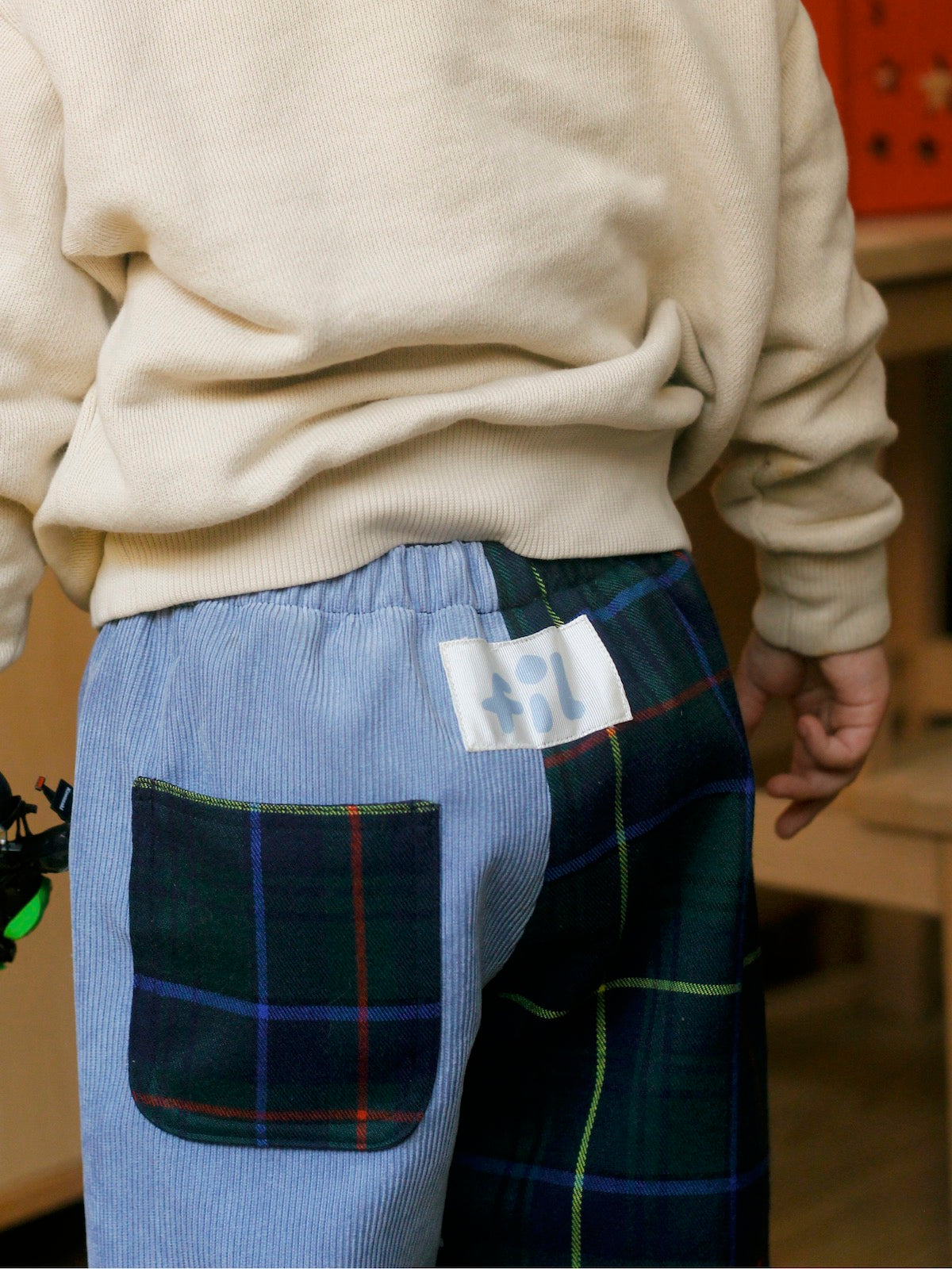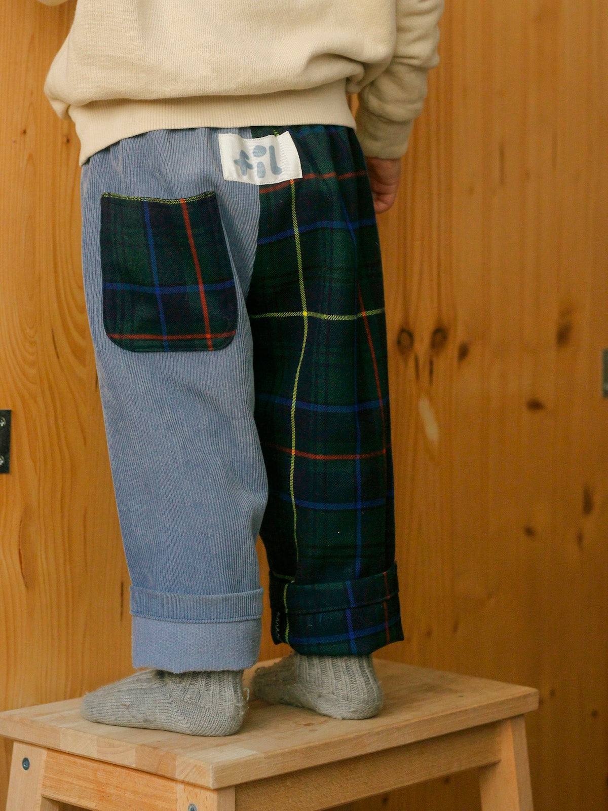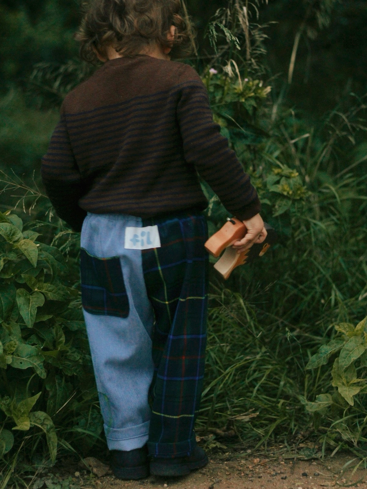 Odile es un pantalón infantil de corte holgado y confortable que favorece el libre movimiento. Su cintura elástica ofrece un ajuste relajado que facilita la tarea de vestirse y permite usar el pantalón por más tiempo. El tejido azul es micropana 100% algodón. El tejido a cuadros verde botella con detalles en rojo, azul y amarillo es una mezcla de 80% poliéster y 20% fibras. Ambos tejidos poseen una textura suave y cálida ideal para días frescos.