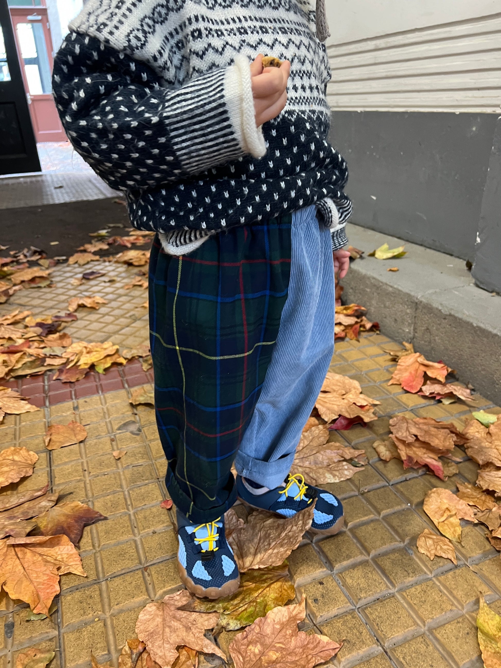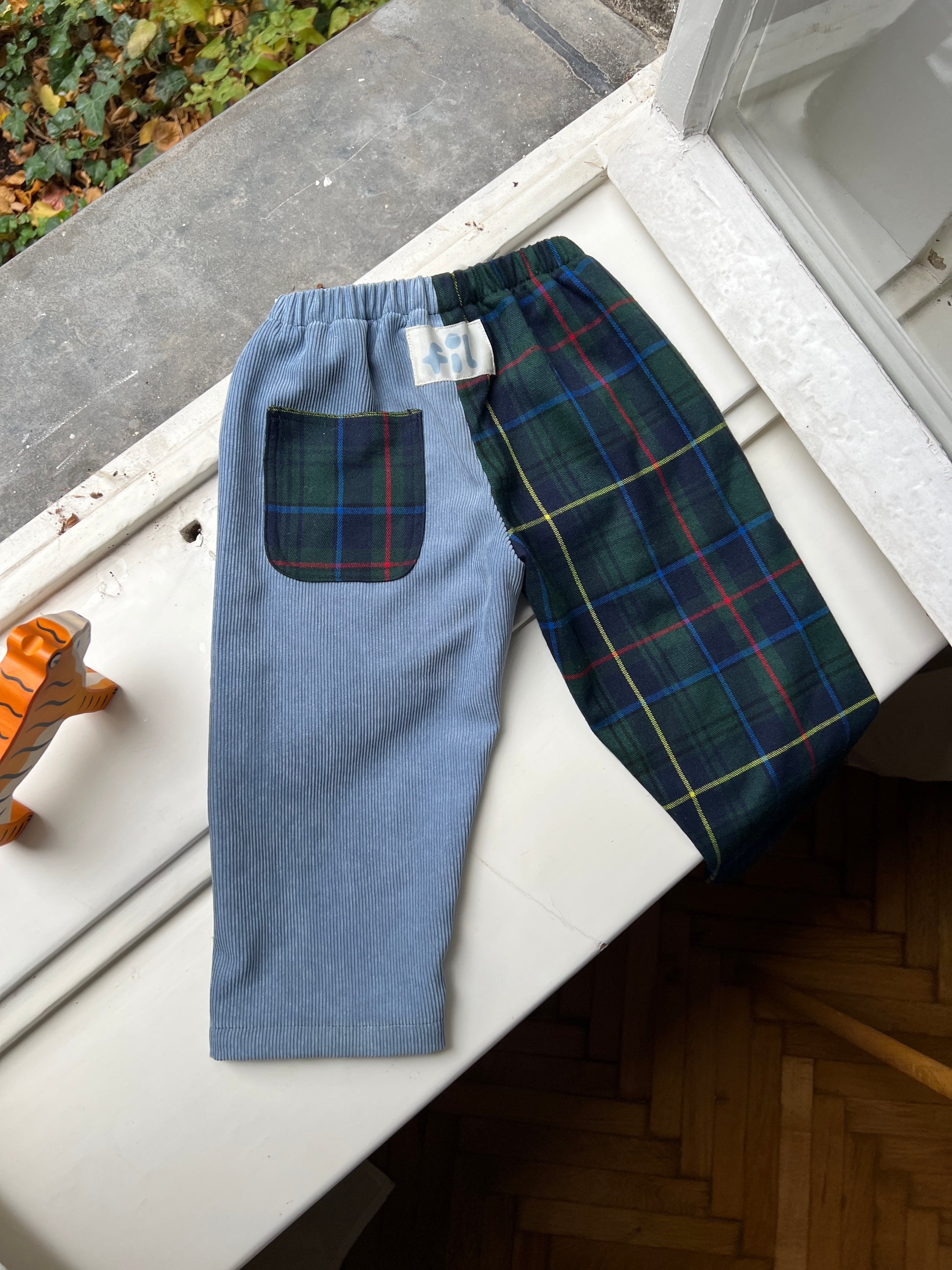 Composición: la tela azul es micro pana 100 % algodón. La tela de cuadros verde botella con detalles en rojo, azul y amarillo está hecha de una mezcla de 80 % poliéster y 20 % fibras.