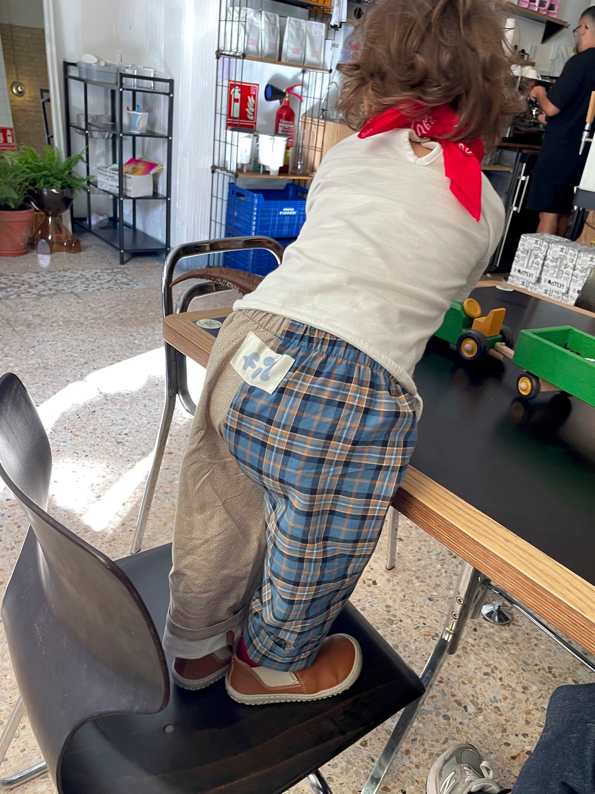 Papageno es un pantalón infantil de corte holgado y confortable que favorece el libre movimiento. Su cintura elástica ofrece un ajuste relajado que facilita la tarea de vestirse y permite usar el pantalón por más tiempo. Este tejido es 100 % algodón y tiene una textura suave y un grosor medio. Presenta un patrón de cuadros en tonos azules y marrones combinado con un sutil estampado en color topo.