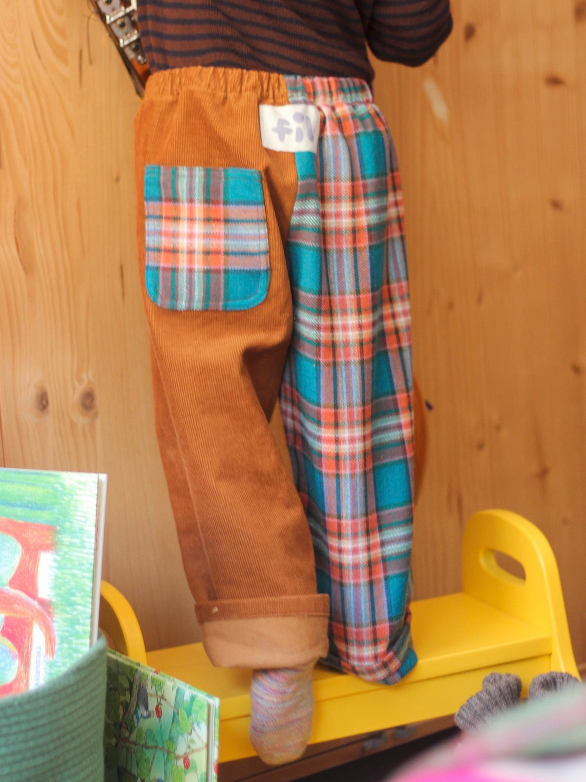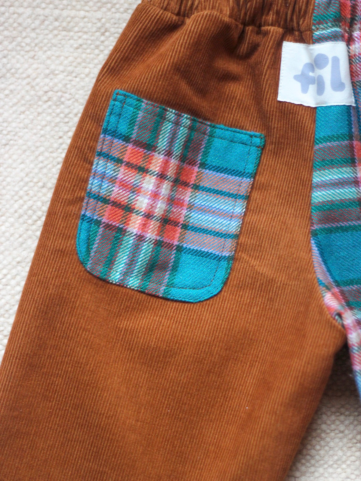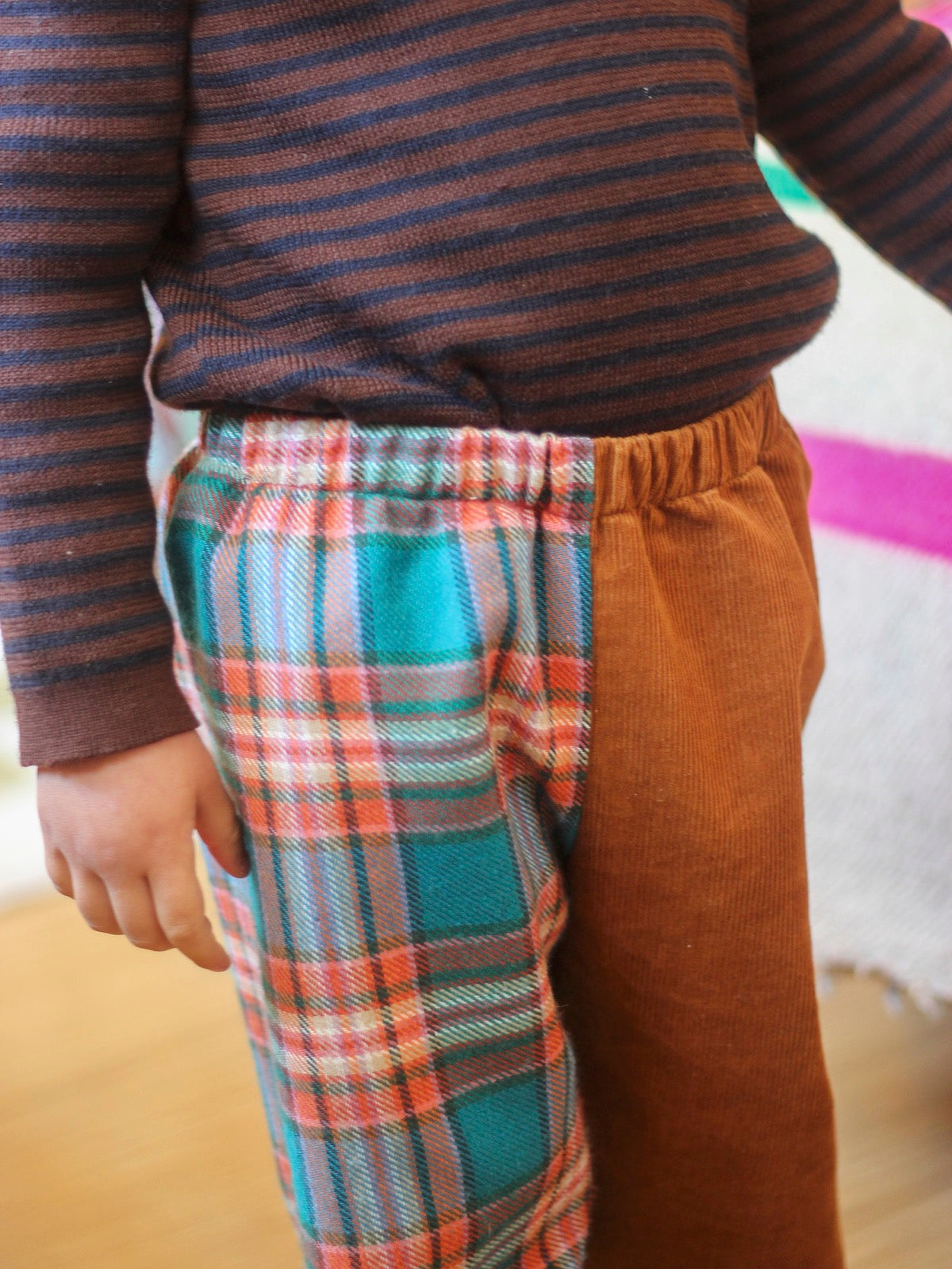 Tejidos nuevos y deadstock: tejido nuevo de micropana marrón combinado con tejido de cuadros deadstock, aprovechada para darle una nueva vida.